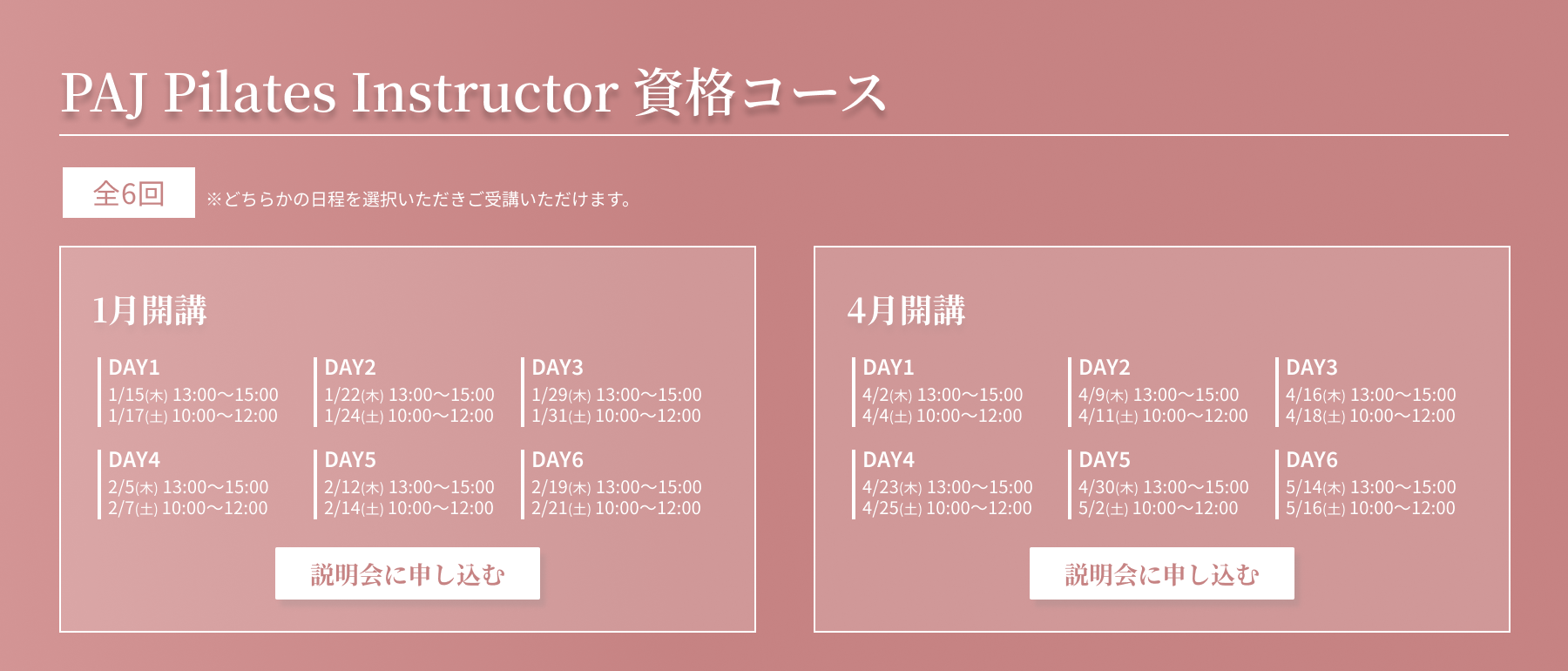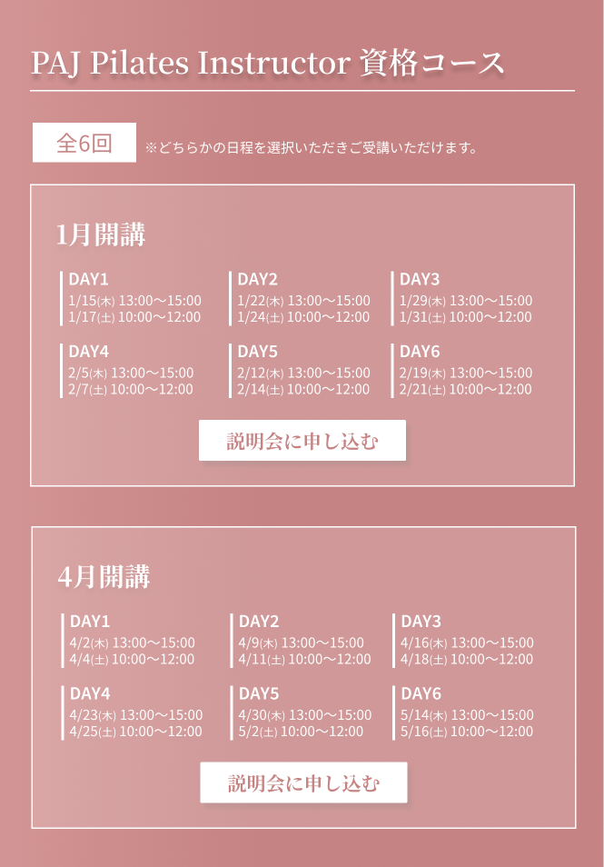 | day6(試験 / 2時間) | 指導・キューイング集中トレーニング / ピラティスインストラクターとして活躍する為に / 試験受講方法 |